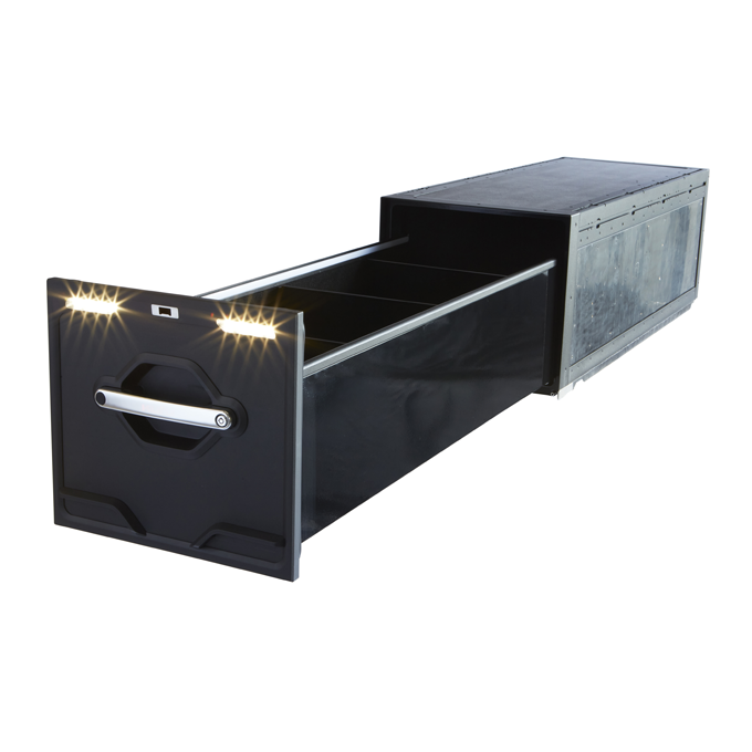 The KUFU Drawer System is the ultimate vehicle storage solution, and a Premium KUFU Drawer is the pinnacle of the thoughtful and innovative system. The KUFU Drawer System is the most innovative and technically advanced, application-focused storage solution. Whether its for recreation, trades or a serious hobby, the KUFU Drawer system will keep your gear safe. With 6 different drawer sizes, and a growing range, classic styling details and trims to suit and compliment your vehicle, a KUFU installation is to be admired. The KUFU Drawer System is adaptable for any type of vehicle or application, based upon the patented Catch-and-Click system, you can connect, disconnect, change and modify your setup whenever you like. With over 6 global patents, mulitple design registrations the KUFU Drawer System is like no other. The innovative Catch-and-Click attachment system is the foundation for the universal mounting platforms, supporting most major vehicles. No other drawer system can be quickly released and reattached to the vehicle or even stacked in a different position. The Catch-and-ClickTM system is part of the over-all ADR compliance, safety and quality is at the heart of what we do. No other drawer protects your gear as well as a KUFU Drawer. Completley sealed, and not just at a top edge, every join in the construction of a KUFU Drawer is gasketed and overlapped for failsafe sealing. An automotive grade pinchweld bulb seal surrounds the perimeter of the Drawer front to seal the closed drawer from dust and weather. So proud and confident are we in our seal that we have included an exhale-valve feature for the convenient easy closure of the Drawer. Each KUFU Premium Drawer is constructed with a purposefully designed glass-reinforced composite panel carcass, robust and strong as well as practical for all of your ideas and KUFU Accessories. The Catch-and-Click system attaches to the robust and serious carcass structure of the KUFU Drawer System. The composite panels carcass is working body of the Drawer, and is bolstered by aluminum L-track mounting rails that feature along the system edges to connect stacking drawers and accessories of all types. The carcass is capped by steel frames and sealed at every join and overlap. Integrated interior and exterior LED lighting that must be seen to be believed. The iconic handle shrouds the soft-touch grip that actuates the elegant locking mechanism, with incremental locking positions through the drawer travel as standard on every system and the ability to lock-in our out to prevent runaway loads. We think it’s the small ideas delivered big that set us apart from the rest. The KUFU Drawer System has confident and smooth action drawer slides, reinforced by the innovative triple-slide layout. A third telescoping slide is added to the working assembly to prevent lateral movement at extended positions and reduces excessive vibrations that can damage slides. The Australian designed and engineered system is assembled in Leopold Victoria from local and imported custom-components. All Kufu Drawer Systems are ADR compliant to 150kg per drawer. You can be satisfied that all your gear is safe, secure, organized and at your finger tips with a KUFU Drawer.