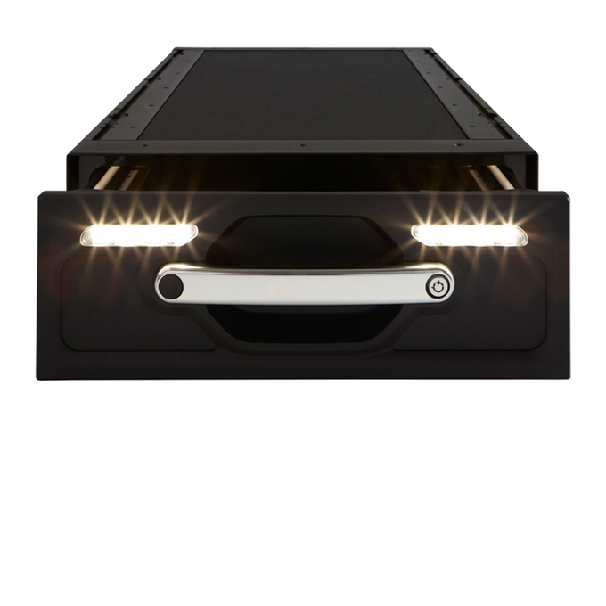The KUFU Drawer System is the ultimate vehicle storage solution, and a Premium KUFU Drawer is the pinnacle of the thoughtful and innovative system.The KUFU Drawer System is the most innovative and technically advanced, application-focused storage solution. Whether its for recreation, trades or a serious hobby, the KUFU Drawer system will keep your gear safe.With 6 different drawer sizes, and a growing range, classic styling details and trims to suit and compliment your vehicle, a KUFU installation is to be admired.The KUFU Drawer System is adaptable for any type of vehicle or application, based upon the patented Catch-and-Click system, you can connect, disconnect, change and modify your setup whenever you like. With over 6 global patents, mulitple design registrations the KUFU Drawer System is like no other. The innovative Catch-and-Click attachment system is the foundation for the universal mounting platforms, supporting most major vehicles. No other drawer system can be quickly released and reattached to the vehicle or even stacked in a different position. The Catch-and-ClickTM system is part of the over-all ADR compliance, safety and quality is at the heart of what we do.No other drawer protects your gear as well as a KUFU Drawer. Completly sealed, and not just at a top edge, every join in the construction of a KUFU Drawer is gasketed and overlapped for failsafe sealing. An automotive grade pinchweld bulb seal surrounds the perimeter of the Drawer front to seal the closed drawer from dust and weather. So proud and confident are we in our seal that we have included an exhale-valve feature for the convenient easy closure of the Drawer.Each KUFU Premium Drawer is constructed with a purposefully designed glass-reinforced composite panel carcass, robust and strong as well as practical for all of your ideas and KUFU Accessories.The Catch-and-Click system attaches to the robust and serious carcass structure of the KUFU Drawer System. The composite panels carcass is working body of the Drawer, and is bolstered by aluminum L-track mounting rails that feature along the system edges to connect stacking drawers and accessories of all types. The carcass is capped by steel frames and sealed at every join and overlap. Integrated interior and exterior LED lighting that must be seen to be believed. The iconic handle shrouds the soft-touch grip that actuates the elegant locking mechanism, with incremental locking positions through the drawer travel as standard on every system and the ability to lock-in our out to prevent runaway loads. We think it’s the small ideas delivered big that set us apart from the rest.The KUFU Drawer System has confident and smooth action drawer slides, reinforced by the innovative triple-slide layout. A third telescoping slide is added to the working assembly to prevent lateral movement at extended positions and reduces excessive vibrations that can damage slides. The Australian designed and engineered system is assembled in Leopold Victoria from local and imported custom-components.All Kufu Drawer Systems are ADR compliant to 150kg per drawer.You can be satisifed that all your gear is safe, secure, organised and at your finger tips with a KUFU Drawer.