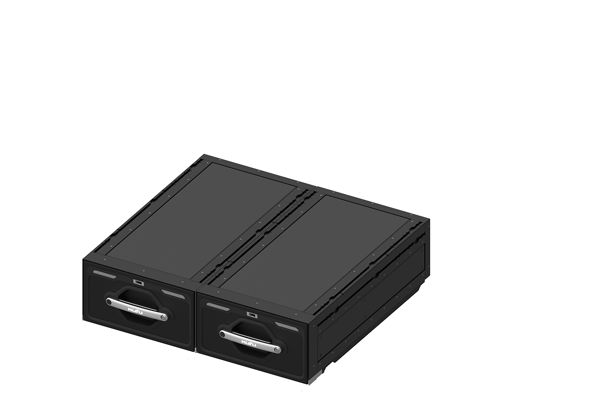 (2) 11"(H) Premium Kufu Catch-and-ClickTM Drawer Units (280mm(H) x950mm(L)) with integrated drawer face task lights and interior full length LED strip lights, interior carpet, key set, premium non-slip top and interior movable cargo dividers. Part No: IIG000761